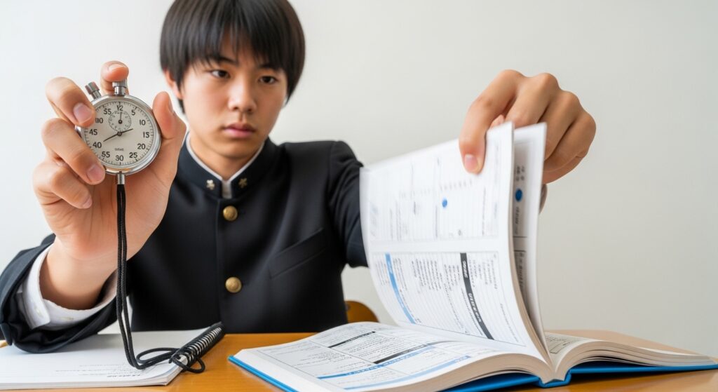 | 英単語・古文単語 社会の一問一答 | 1〜2秒 | パッと見て意味が出なければ、即座に答えを見る。絶対に「うーん」と悩まない。悩む時間は記憶の定着に寄与しません。テンポよく千本ノックのように回します。 |