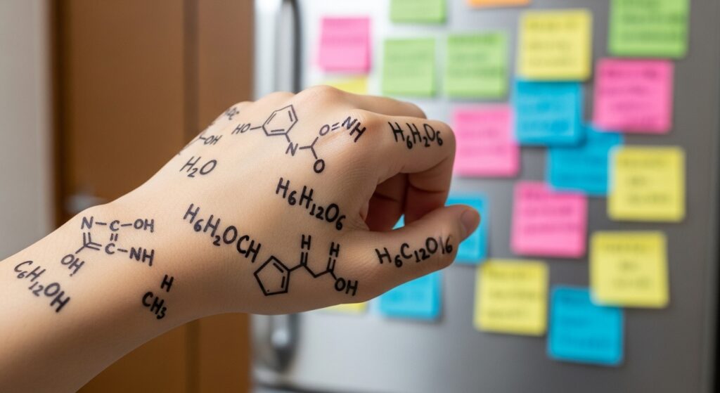 笑われるかもしれませんが、私はどうしても覚えられない化学式を手の甲に油性ペンで書いていました。