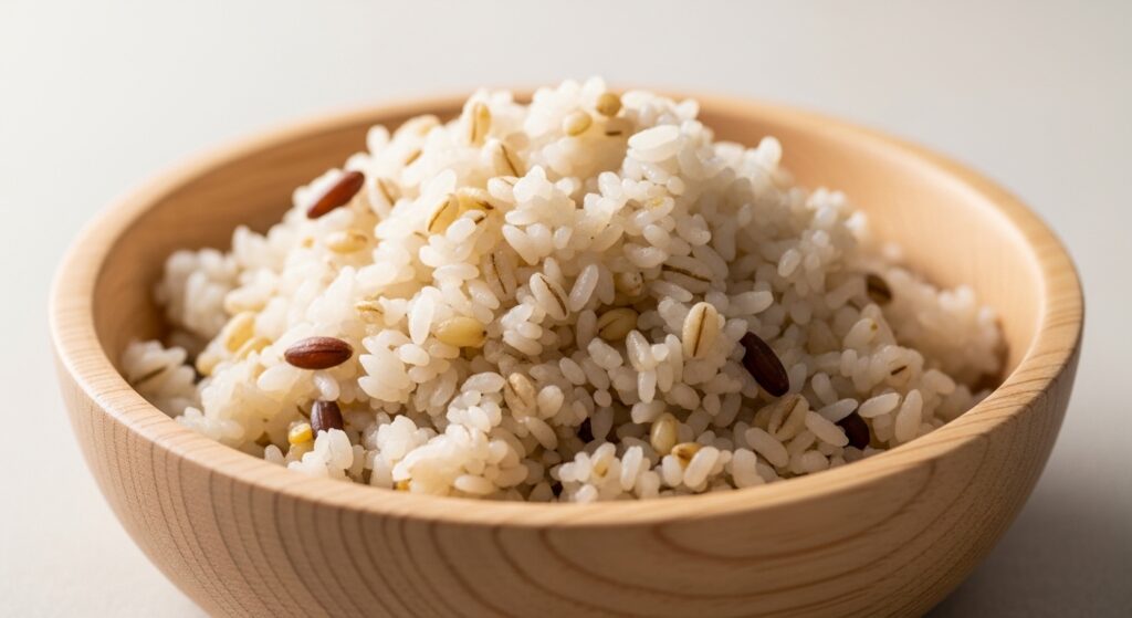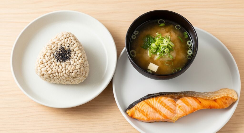 これが最強です。もち麦に含まれる水溶性食物繊維(β-グルカン)は、糖質の吸収を穏やかにする効果が非常に高く、食後の眠気を防ぐ「セカンドミール効果」も期待できます。具材の「梅」のクエン酸で疲労回復、「昆布」のミネラルも摂れる、まさに受験生のための完全食です。