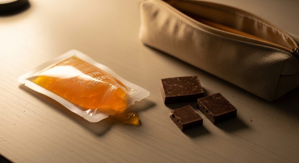 • ゼリー飲料(最重要): 「ウィダーinゼリー」や「アミノバイタル」などのパウチ型ゼリーは必須装備です。これらは「マルトデキストリン」という消化吸収に優れた糖質を含んでおり、数分でエネルギーに変わります。噛む必要もなく、少しずつ飲めるので、胃への負担も最小限です。