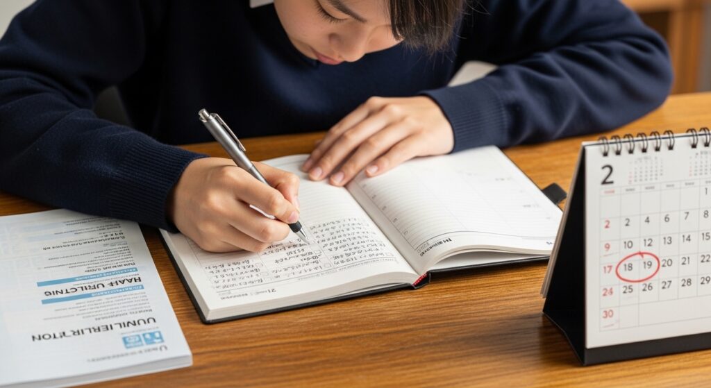3. 学校との兼ね合いを決める: 学校の履修科目とズレる場合は、「学校の授業をどう処理するか(全力でやるか、流すか)」の方針を決めます。
