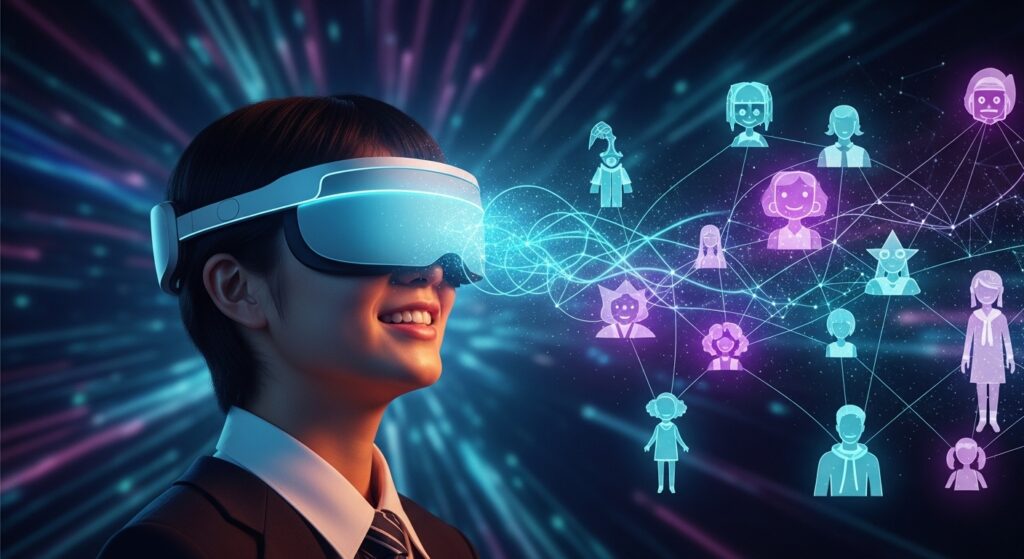オンラインのグループワークや、メタバース空間を活用した仮想コミュニティでのプロジェクトを通じて、全国(あるいは世界中)にいる多様なバックグラウンドを持つ学生たちと繋がり、協働することがカリキュラムに組み込まれています。